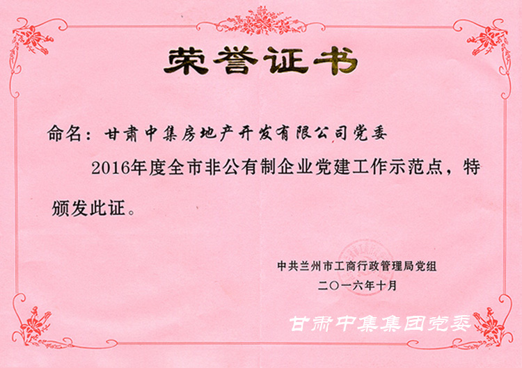 2017年10月10日,由蘭州市工商行政管理局評(píng)選的2016年度全市非公有制企業(yè)“黨建工作示范點(diǎn)”面向全市發(fā)布,甘肅中集房地產(chǎn)開(kāi)發(fā)有限公司黨支部喜獲全市非公有制企業(yè)“黨建工作示范點(diǎn)”殊榮并獲得由蘭州市非公委補(bǔ)貼黨建專(zhuān)項(xiàng)經(jīng)費(fèi)20000元。