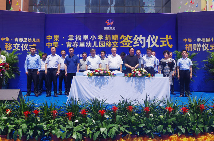 2017年6月22日下午14時,甘肅中集實業(yè)集團有限公司通過甘肅省慈善總會,向蘭州市安寧區(qū)人民政府捐贈價值1.02億元中集•幸福里小學暨中集•青春里配建幼兒園移交儀式在中集•幸福里小學操場隆重舉行。甘肅省原人大常委會副主任、甘肅省慈善總會會長朱志良,甘肅省原民政廳黨組書記、廳長、甘肅省慈善總會常務(wù)副會長梁國安,甘肅省教育廳副廳長趙 凱,蘭州市人大常委會副主任孫曉鋼,蘭州市人民政府副秘書長淡漢榮,安寧區(qū)區(qū)委書記王 方及安寧區(qū)區(qū)委副書記、區(qū)長雒澤民攜安寧區(qū)委、區(qū)人大、區(qū)政府、區(qū)政協(xié)四大班子領(lǐng)導,蘭州市教育局、蘭州市國土局、蘭州市規(guī)劃局、蘭州市房產(chǎn)局相關(guān)領(lǐng)導出席捐贈儀式,甘肅中集實業(yè)集團有限公司黨委書記、董事長周啟濤代表公司完成與安寧區(qū)人民政府捐贈及移交簽約。