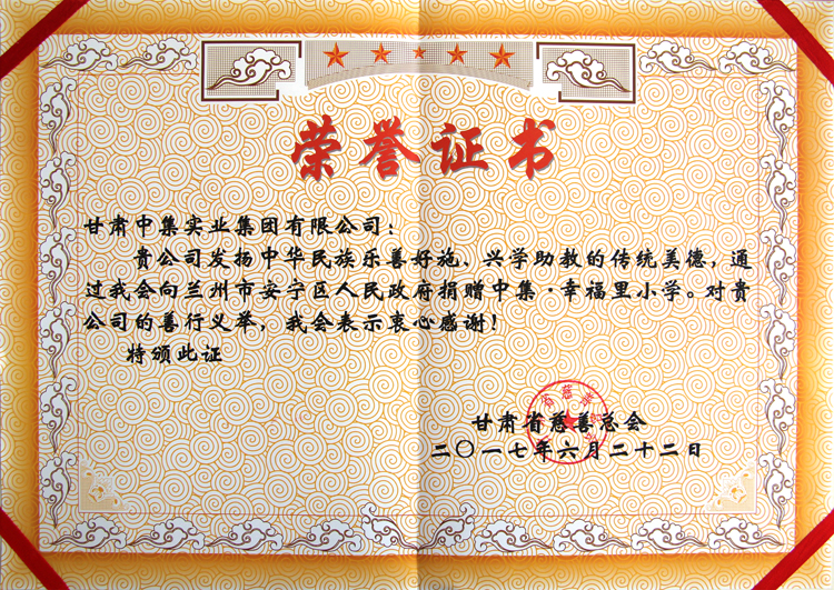 甘肅省慈善總會朱志良會長向甘肅中集實業(yè)集團有限公司董事長周啟濤頒發(fā)榮譽證書
